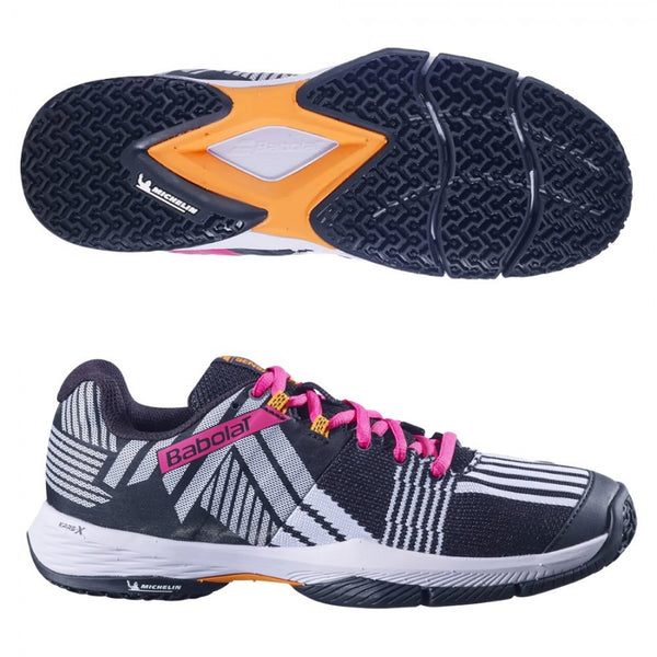 zapatillas de pádel Babolat Sensa Women, diseñadas con plantilla Ortholite para una mayor suavidad en la pisada y evitar que se acumulen las bacterias. Empezando por la suela que es 100% pádel se ha diseñado combinando el dibujo de espiga junto a los tacos lo que proporciona una gran tracción para que puedas llegar a todas las bolas. Siguiendo por esta zona encontramos dos ranuras en la parte delantera que mejoran la flexión del pie.
